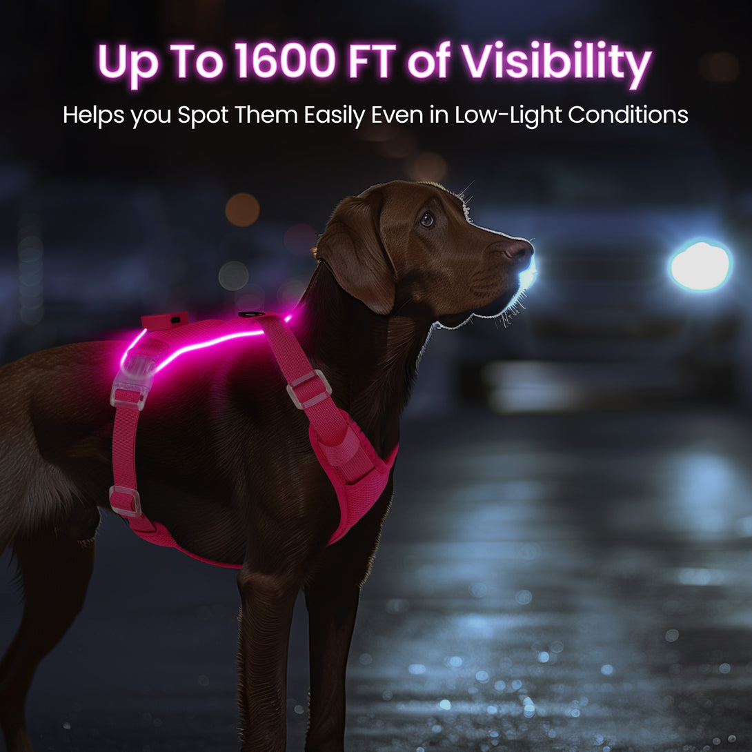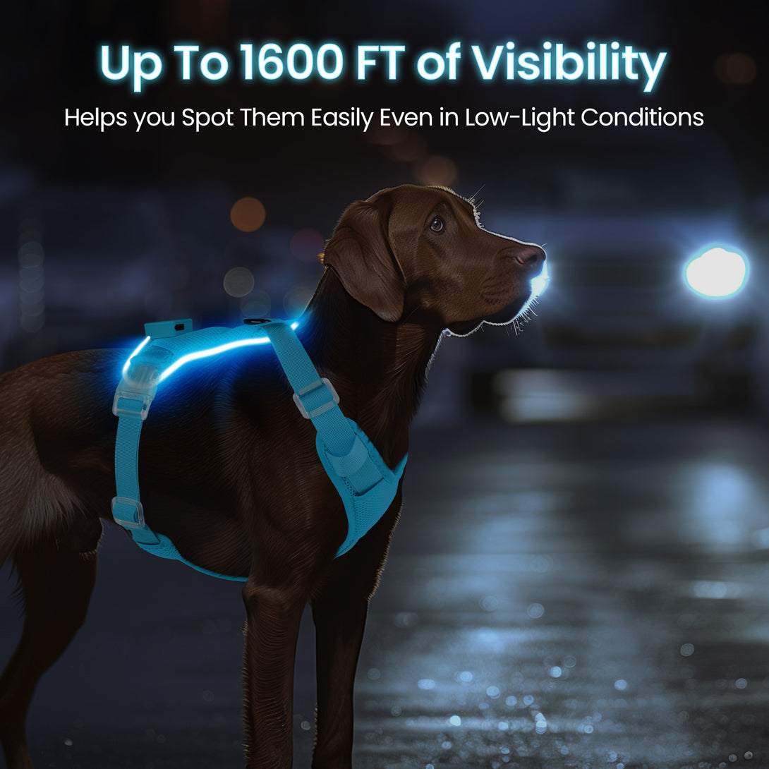 HIGH VISIBILITY:Our Light up dog harness adopt bright LED Fiber Optic, provides 360-degree visibility up to 1600 feet ,keep your pet visible in the dark,avoid accident and lost , improves pet’s safety.Great for casual walks,jogging,hiking,etc.