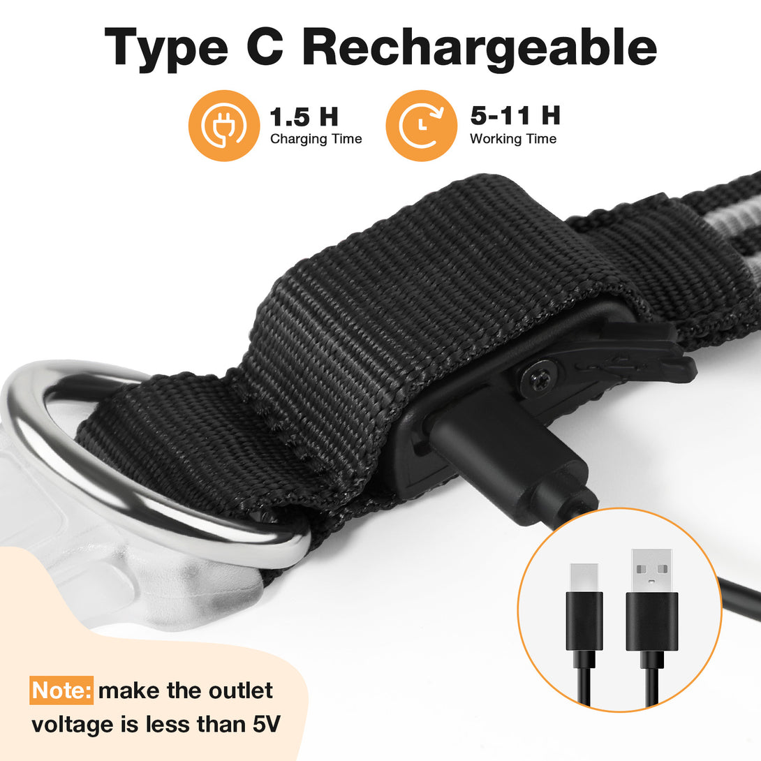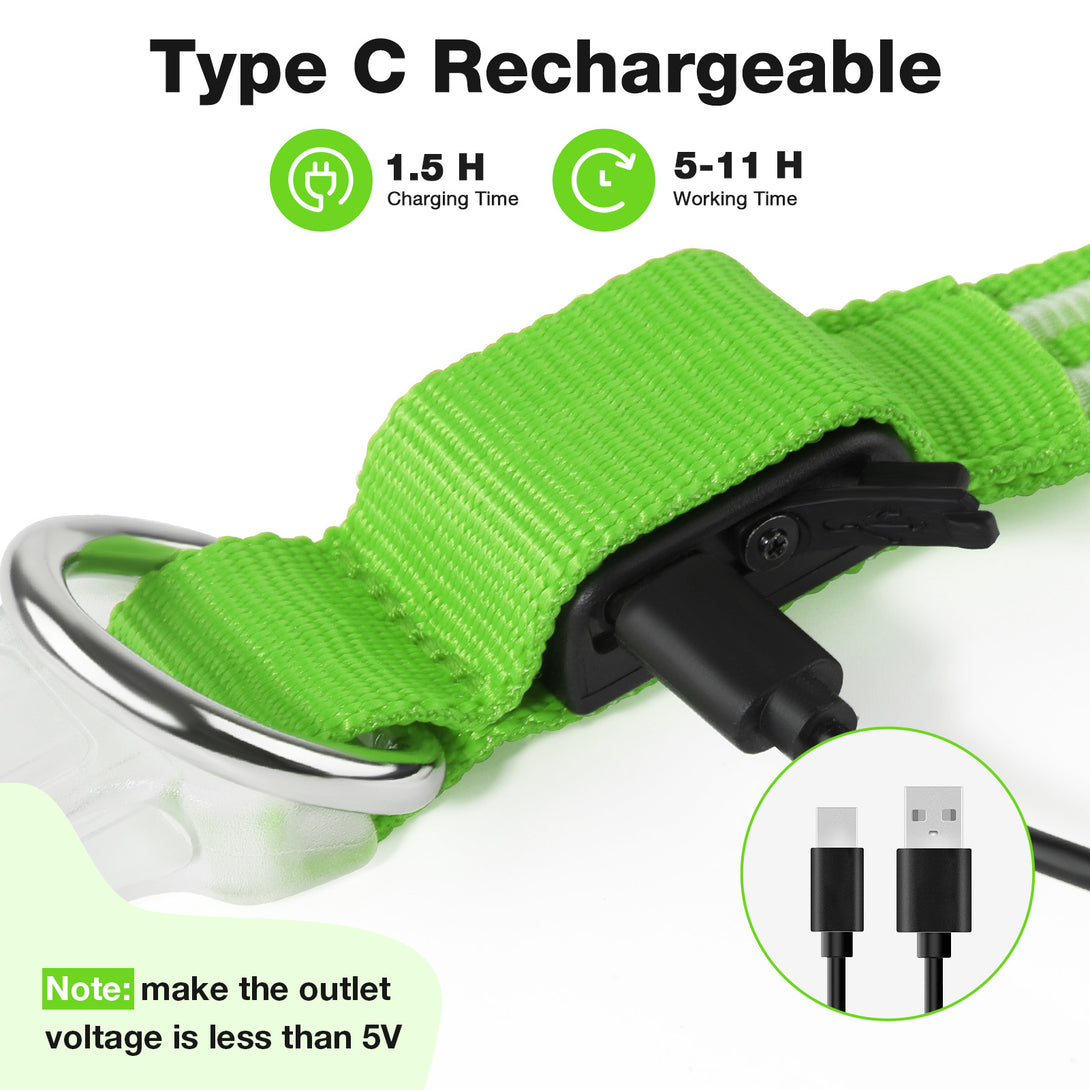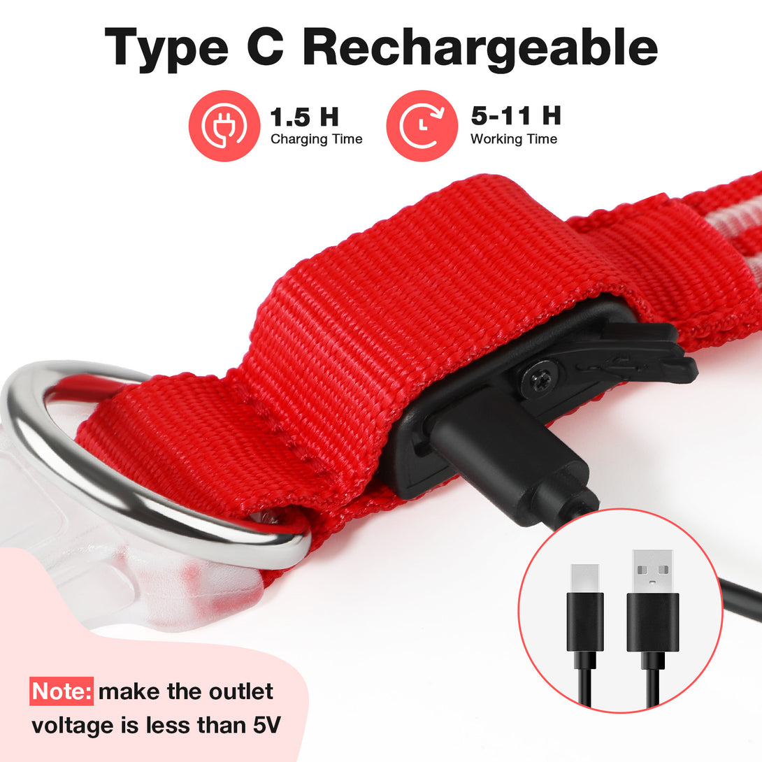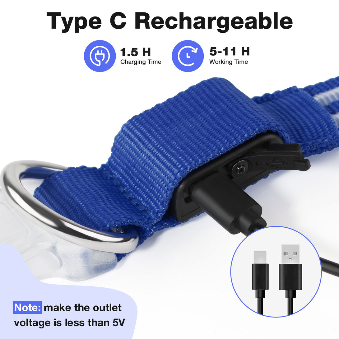 - Led Dog Collar Rechargeable: Our TYPE-C rechargeable light up dog collar working 8 hours on a single charge, can connect computer, car charger and power bank. No worry about battery replacement and no additional costs .