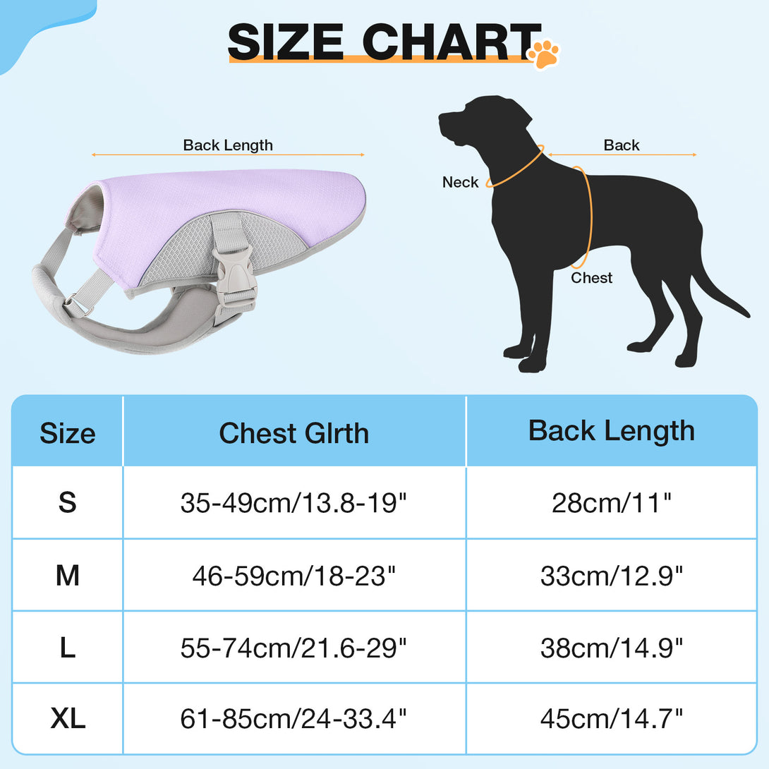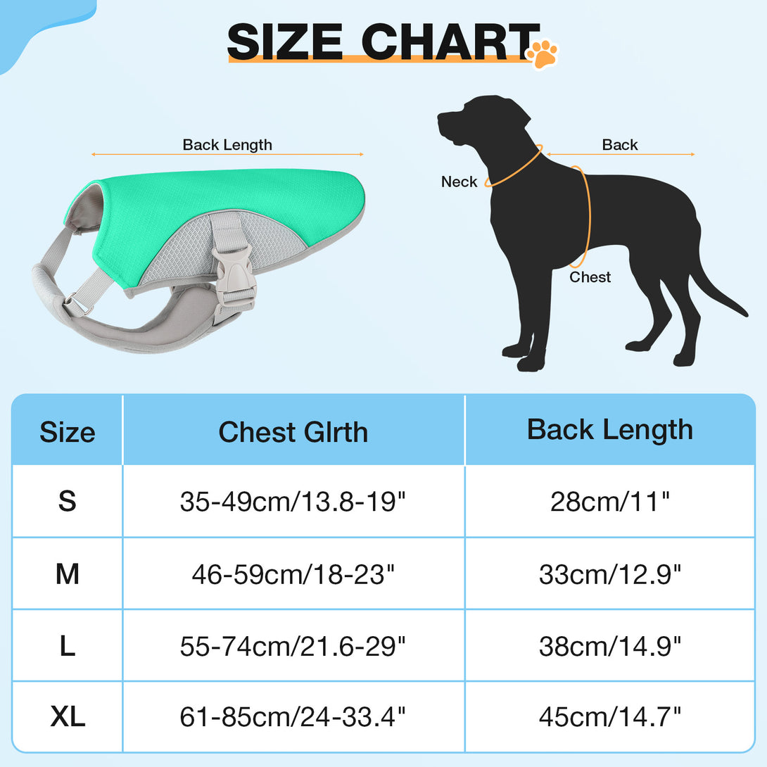 - SIZE SELECTION: Our dog cooling undershirts are available in sizes ranging from S to XL. Before ordering, please measure your dog's chest and neck accurately, pay attention to the length of the back, then refer to our size chart to choose the right size for your furry companion